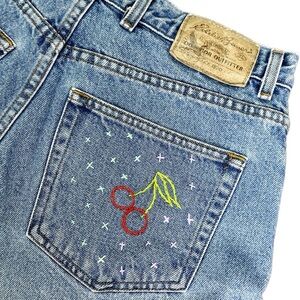 Gorgeously upcycled pair of 90s light/medium wash Eddie Bauer long jean shorts - features star embroidery on the front pocket and cherries in the back pocket - can be worn rolled or straight
