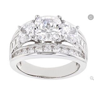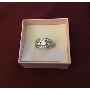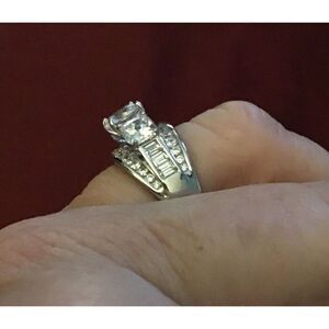 This ring is gorgeous and with a truly believable “real” look, everyone will think you broke the bank to own it. A center high prong set center one carat AAA quality simulated diamond gemstone is flanked on each by 1/2 carat cushion cut stones. There are baguette cut stones that are set down the center beside the cushion cut stones. Round cut channel set stones are set in a row at both the top and bottom of the ring. The total carat weight in the ring is 3.82 carats. The setting and band are done in .925 solid sterling silver and is stamped for authenticity. It is size 9.