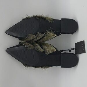 Add a bold and artistic edge to your outfit with these striking Zara Basic Collection flat mules. Designed with pointed toes and layered metallic fringe detailing, these black slip-on flats are fashion-forward and easy to pair with anything from jeans to a dressy night-out look.