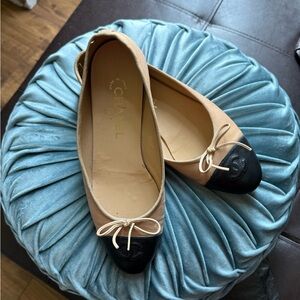 Elegant Chanel ballet flats in beige and black. Perfect for a chic and comfortable look.