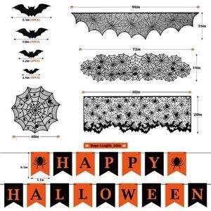 🧿Value Pack: You will get 1 fireplace mantel scarf (18" x 96"), 1 rectangular table runner (18" x 72"), 1 round table cover (40"), 1 spider lampshade with ribbon (20" x 60"), 32 PCS 3D bat wall stickers (4 different sizes), 1 gauze creepy cloth (150" x 30") and 1 Halloween banner, quite enough to meet your Halloween decorations needs.