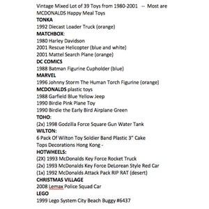 Vintage Mixed Lot of 39 Toys from 1980-2001 -- Most are MCDONALDS Happy Meal Toys TONKA 1992 Diecast Loader Truck (orange) MATCHBOX : 1980 Harley Davidson 2001 Rescue Helicopter (blue and white) 2001 Mattel Search Plane (orange) DC COMICS 1988 Batman Figurine Cupholder (blue) MARVEL 1996 Johnny Storm The Human Torch Figurine (orange) MCDONALDS plastic toys 1988 Garfield Blue Yellow Jeep 1990 Birdie Pink Plane Toy 1990 Birdie the Early Bird Airplane Green TOHO : (2x) 1998 Godzilla Force Square Gun Water Tank WILTON: 6 Pack Of Wilton Toy Soldier Band Plastic 3 Cake Tops Decorations Hong Kong - HOTWHEELS: (2X) 1993 McDonalds Key Force Rocket Truck (2x) 1993 McDonalds Key Force DeLorean Style Red Car (1x) 1992 McDonalds Attack Pack RIP RAT (desert) CHRISTMAS VILLAGE 2008 Lemax Police Squad Car LEGO 1999 Lego System City Beach Buggy #6437