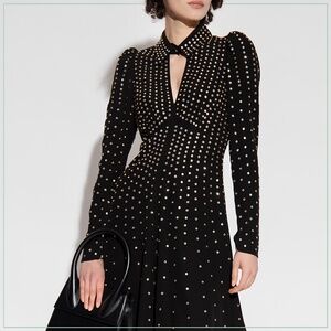 “Our ‘Dallas’ dress is saturated in scores of light-catching crystal studs. Fastened with a concealed side zip, this fitted, flared-skirt design features a decorative cut-out in the front, a chic, buttoned collar and long sleeves with buttoned cuffs.”