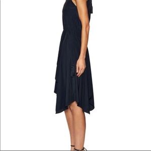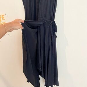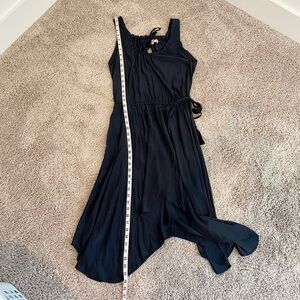 $395 CALYPSO ST BARTH Sarah Asymmetrical Relaxed Fit Modest Midi Dress. Faux wrap with high neck and keyhole tie back. Has a drawstring waist. Navy Blue and no visible flaws.