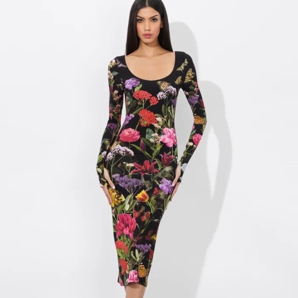 Alice + Olivia’s Delora midi-dress features a floral print and features a scoopneck and long sleeves with thumbholes.