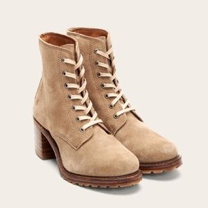 $399 Frye Sabrina 6G Lace Up Beige/Tan Suede/Leather Combat Heeled Ankle Booties