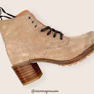 $399 Frye Sabrina 6G Lace Up Beige/Tan Suede/Leather Combat Moto Cute Ankle Boot