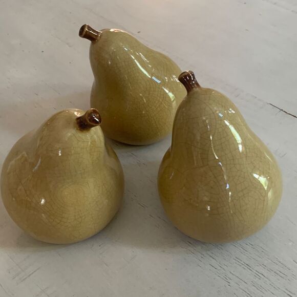Set of 3 ceramic pears. Crackled glaze. Each approx 5” tall. Like new.