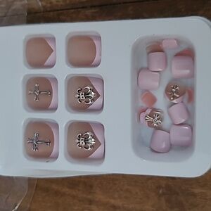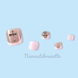 Short Nails | 3D Cross Pattern Nails | Square Nails | Fake Nails | False Nails | Press Ons | Vintage | Retro | Rock Pedicure | Reusable | Punk Pedi | Grunge Nails | Pink | Silver | Goth | French Pedi|