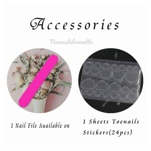 Quantity - Set of 24 nails in sizes tiny to large! This means no need to size your nails before purchase! 1 file and adhesive strips.