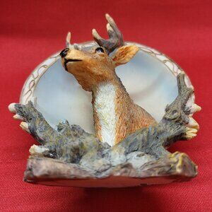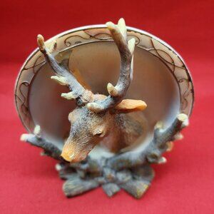 A decorative figurine of a deer's head and shoulders. The deer is depicted with antlers and a detailed, textured coat, and it is mounted within a circular frame with an ornate, patterned border. The base of the figurine is sculpted to resemble a fallen log or tree branches.