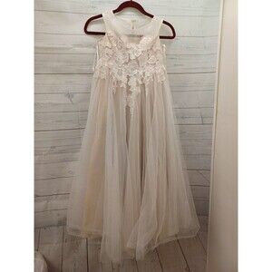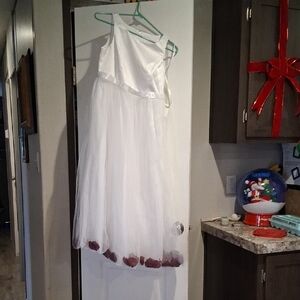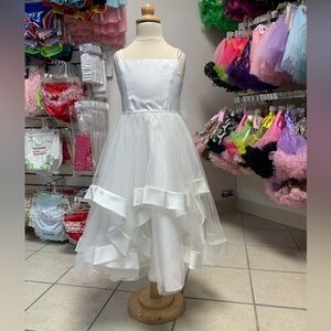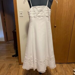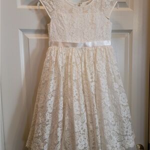 Beautiful white flower girl dress with floral lace details and a satin ribbon.
