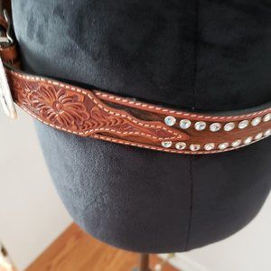 This beautiful 3-D Hair-On Hide Crystal Studded Leather Belt measures 1 1/4" wide down to 7/8" wide. It has a nice, tooled section on the ends with white accent stitching on the edges of the entire belt....and a silver buckle...