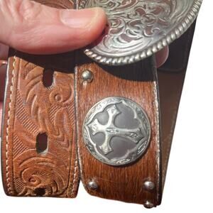3D Belt Co Kids Hand Tooled Leather Cowboy Western Belt with Cross Conchos and Ornate Silvertone Buckle.
