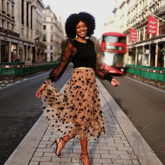 3D Posy Double-Layered Mesh Midi Skirt in Caramel