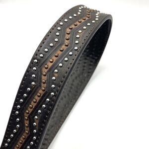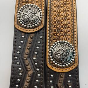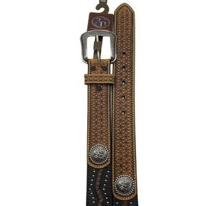 NWT 3D Belt Company Men's Studded Tooled Leather belt in tan and brown color with zig zag silver and copper studded design. Accented with round silvertone floral conchos on each end.