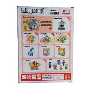 A variety of different amusement park circus facilities: dancing boat, rotating cup, Pirate Sea rover, Carousel, Ferris wheel. ASSEMBLED PIECES MOVE BACK AND FORTH AND ROTATE.