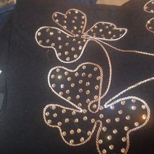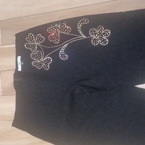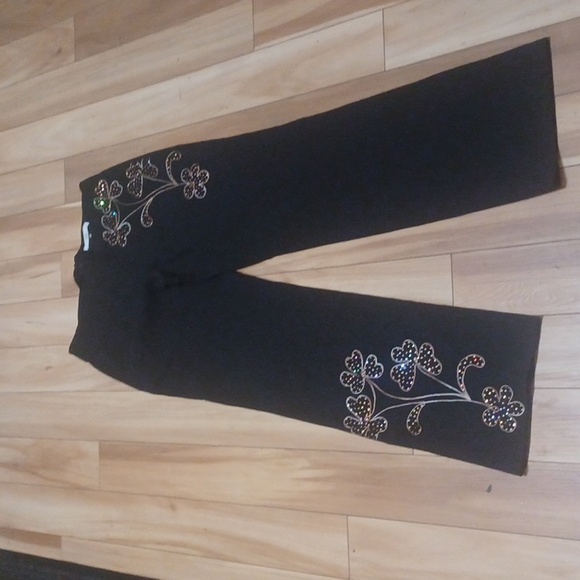 Black 3Di pants with gold embroidered flower on leg and upper front of pants.pants zip up the back.