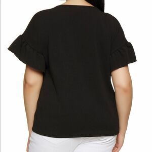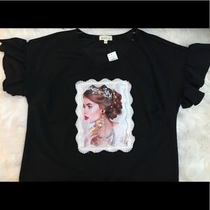 Ladies beyond Cute Black Short ruffles sleeve 3D jewelry Embellished Statement Blouse. New with tags.