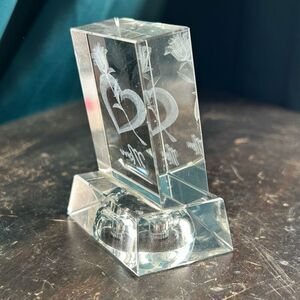 Crystal 3D Laser etched paperweight depicting a heart and rose with Mom spelled below.