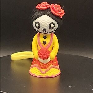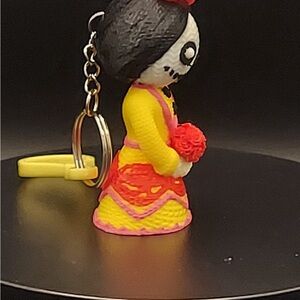Set of two 3D printed skeleton Day of the Dead keychains with colorful outfits. Perfect for adding a fun touch to your accessories.