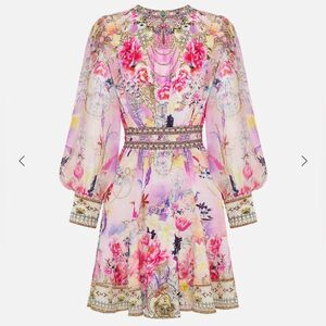 The Call Of The Canal Button Front Frill Dress revels in the rich opulence of intricate tapestries of gilded fronds and fragrant bouquets. Adorned with exquisite crystal embellishment, this silk mini dress is a true masterpiece that combines elegance and statement-making style. The voluminous blouson sleeves add romantic allure to the mini dress while the elegant low-cut V neckline meets delicate button detailing down the center, adding a touch of sophistication. The fitted waistband cinches in the waist and flows into the relaxed two-tier skirt creating a poetic billow every step. Lovingly handcrafted,designed in Australia. Explore more from the Amore Mio collection.