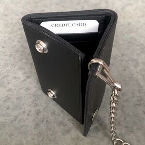 Leather snap-shut wallet. 7 inner slips/pockets including 1 window. 4 inch wallet. 14 inch chain. 3 inch leather belt loop at the end of chain.