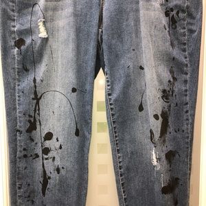 The Lane Bryant Low Rise Boyfriend Jeans in Cotton/Spandex has cuffed ankle styling, denim cotton/spandex distressed and deconstructed fabric which offers excellent stretch & comfort. These have Low Rise Fit with tapered leg, five (5) pockets, a button zip fly closure & belt loops. The front has and abstract black painted design. Both back and front are more distressed with shreds (see photos). These jeans are perfect for casual, work or play! π3 X Host Pick! π