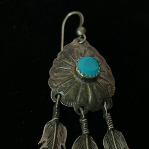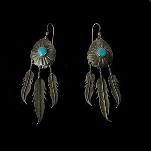 This is a pair of Long Vintage Navajo Sterling Silver Turquoise CONCHO Feather Dangle Earrings