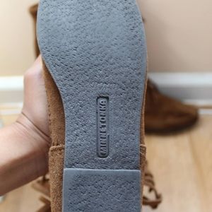 Minnetonka boot. The three layers of suede fringe wrap all the way around. Boots meet you mid-calf, padded insole and thin rubber sole. True to size, 12-in height, 13.5-in calf circumference. Used and in great condition!