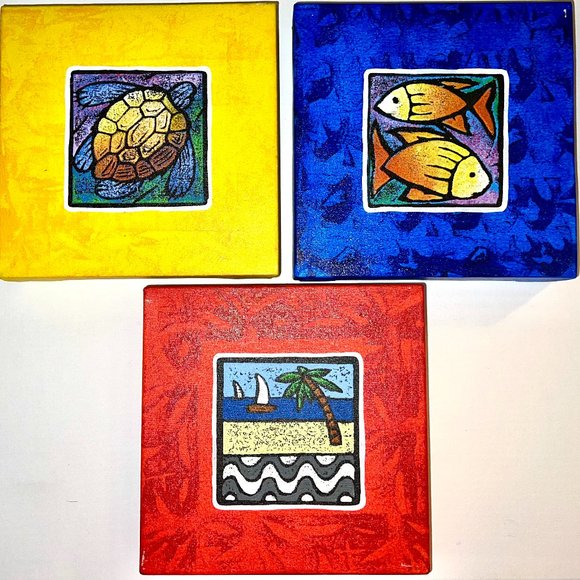 3PC SEALIFE/BEACH HANDFRAMED PAINTED CANVASES BY ARTIST SICCURO NO DATE 3 COLORS