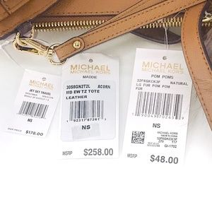 MICHEAL Michael Kors Maddie Medium East West Top Zip Tote Wallet Charms Color: Acorn Cross Grain Leather Gold Hardware Front & Back Slip Pockets Top Zipper Closure Padded tablet compartment 1 Zip Pocket 2 Slip Pockets Dual Handles: 11” Drop 15”W x 10.75”H x 5”D Michael Kors Jet Set Travel Double Zip Wristlet Wallet Brown/Acorn with Gold Hardware Snap Closure & Saffiano leather 1 Window ID 6 Credit Card Slots 2 Multi Purpose Slot 4"H x 7.25"L x 1.5"D No Trades No Lowball Offers