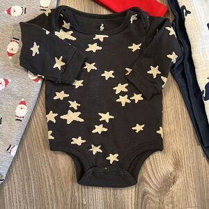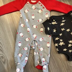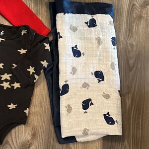 Selling these three pieces as a bundle for your little baby boy! Long sleeve, Santa, onesie, and long sleeve, neutral, star, onesie from the brand lullaby. Both are super soft and cozy! Also included is a whale blanket that is muslin on one side and satin on the other. Blanket measures 30 x 30
