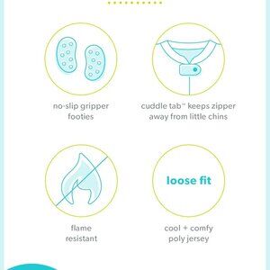 Features: This fun trio of footed pajamas offers cozy, relaxed comfort with a loose fit perfect for active little sleepers. Made from soft, flame-resistant polyester jersey, they provide peace of mind and warmth. The vibrant prints add a playful splash to bedtime, and the full-zip closure makes changing a breeze. A chin tab prevents zipper discomfort, ensuring your baby stays comfy all night.