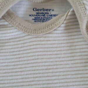 The Gerber Baby Boy 3 pk Charming Bear Print Short Sleeve Onesies in size newborn are adorable and comfortable one-piece outfits perfect for baby boys. Made from 100% cotton , these onesies are lightweight, breathable, and easy to care for with snap closures for easy dressing. The bear print pattern and character theme make them ideal for various occasions including travel, activewear, parties, and casual wear. With a round neckline and short sleeves, these onesies are suitable for all seasons and are machine washable for convenience. Set includes one white and tan stripes, one white with tan bear paw prints and one blue with mama bear and cub print, perfect for any little boy's wardrobe.