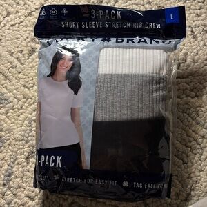 3-pack of short sleeve stretch rib crew shirts. Includes black, gray, and white colors. Comfortable and stylish.
