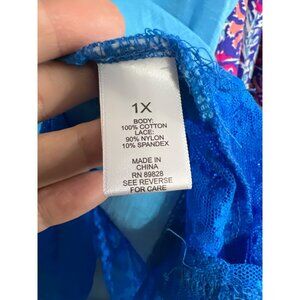 This collection includes three tops in size 1X, featuring both short and 3/4 sleeve styles. Each top showcases unique lace trim accents. The vibrant color palette and convenient pockets enhance the design and functionality, making them versatile for various occasions. 2 Lori Goldstein and 1 Caffe Marakesh tops