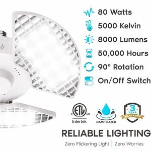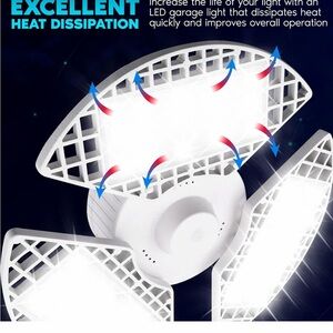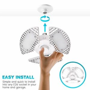 Super bright LED garage light with adjustable panels. Ideal for garages and workshops. Daylight color for clear visibility.