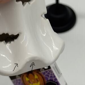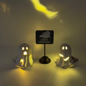 • 2 ceramic ghost figures with light up LED eyes. One has cut outs of stars and the other has bats. Each ghost is approx 4” high.