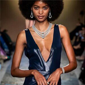 - **Statement Necklace**: A bold design with multi-layered silver chains and smooth, polished beads at the center for a striking yet elegant look.