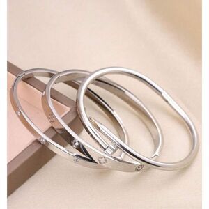 Beautiful 3 piece designer inspired silver bracelet/bangle set includes 2 CZ accented clover bracelets and 1 nail clover bracelet. Wear 1 at a time or all together. The choice of style is yours.