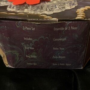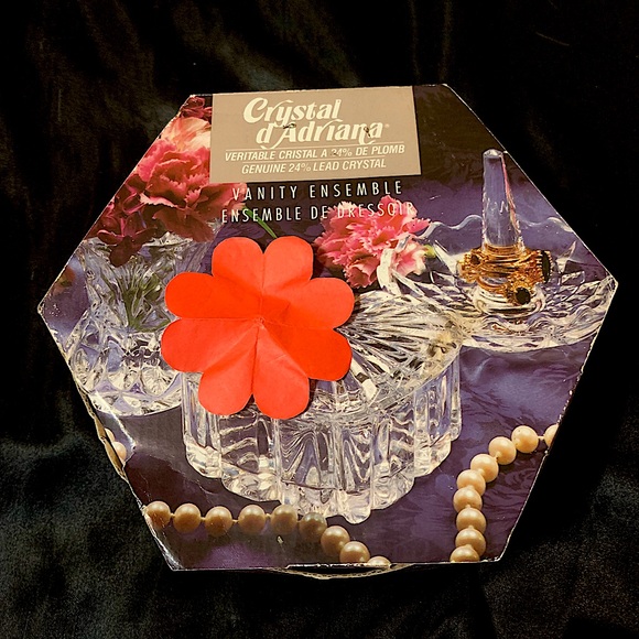 Vintage Crystal d’Adriana. Vanity Ensemble Includes: a Bud vase, Ring holder, & Trinket box. Made in Yugoslavia. Never used. Still in box.