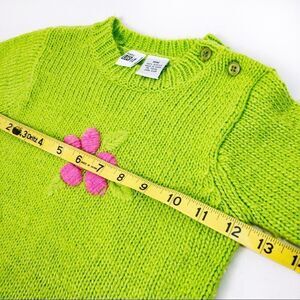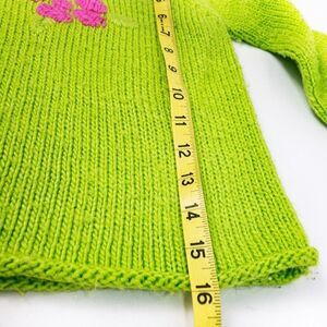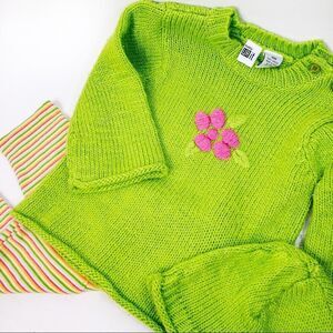 Cozy acrylic sweater in bright green with a pink embroidered flower, matching knit beanie hat, and striped leggings.