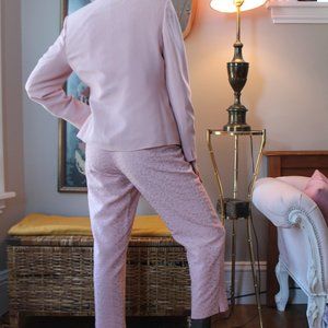 Three-piece pink silk suit!!! The blouse and pants are both covered in embroidery, the top featuring hidden pink buttons and the bottoms featuring a hidden side zip. I don't believe they were ever worn, as I opened the jacket pockets so you can hide the pocket flaps (done after photographing) and there are slits at the wrists still sewn closed, visible in the 2nd pic. It has 3 buttons down the front. The top and blazer are both size 12 while the pants are size 10. All are perfect and fully lined in matching poly and made by Josephine Chaus. The blouse measures 20" flat from pit to pit, pants measure 15" across the waist, 20" across the hips (widest point), 36" outseam, 26" inseam, 12" rise, and 7" across the lining hem.