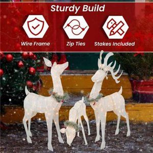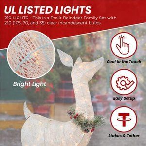 🧿3-PIECE SET - This eye-catching Reindeer Family yard art decoration features a buck, doe, and fawn, making it a beautiful addition to your lawn. It comes with metal stakes and spare light bulbs for easy setup, and the 210 lights are safe and UL Listed for both indoor and outdoor use.