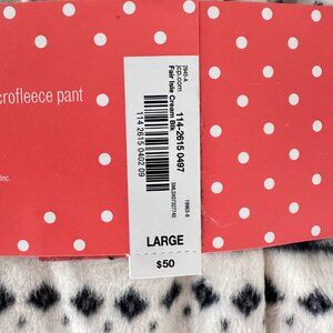 Unopened set of cozy but lighter-weight microfleece PJs, including a red camisole and a black, long-sleeved, cozy sweater with white serged trim. The pants are a cream color with black winter motif.