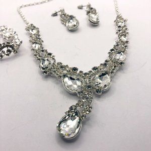 Queen for a day! Or as long as you wish with this extravagant sparkling statement 3-piece set. So fun and fancy! The dangle earrings just over 1.5" The necklace 11" - 12.5" with extender. The bracelet is 6.5" - 9.25" with extender. Just exquisite. Costume jewelry of faux white diamonds in a silver tone setting. Tags: elegant, bride, prom, wedding, princess, movie star, cocktail party, bubble bath
