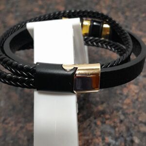 This beautifully crafted bracelt has a fabulous magnetic closure that makes the bracelet look smooth and solid. It measures 7" without the gold clasp. The pebbled and woven leather have a lovely contrast. It is in new and perfect condition. It could br unisex as well.