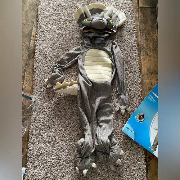 3T-4T triceratops costume from Spirit Halloween. Perfect for boys or girls. Great for Halloween or even just playing dress up. It does have a voice box in the hand that roars. It does have some slight wear on the black parts that go under the shoes so the shoes are covered with the dinosaur feet. Costume was only worn once for Halloween.