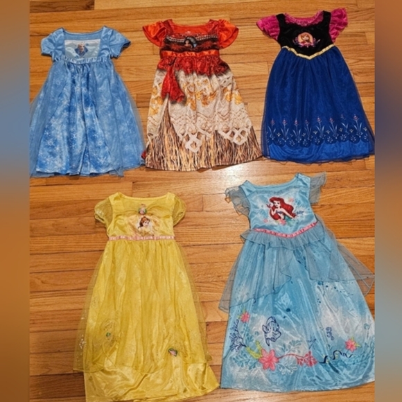 Disney princess nightgowns in size 3T. Elsa, Moana, and Ariel are in good condition with only minor signs of wear. Anna has tear near shoulder. Belle has multiple pulls in the tulle.